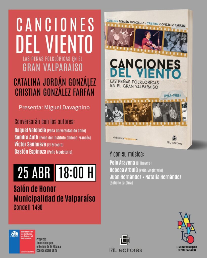 El viernes 25 de abril, a las 18:00 horas, se presenta el libro Canciones del viento. Las peñas folklóricas en el Gran Valparaíso (1965-1986), de Catalina Jordán González y Cristian González Farfán, publicado por RIL Editores.