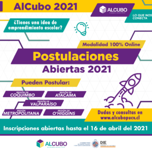 La Pontificia Universidad Católica de Valparaíso a través de su Incubadora Escolar AlCubo, lanzó su 10ª Convocatoria  de Emprendimiento Escolar 2021, para equipos escolares de establecimientos educacionales de enseñanza básica y media de las Regiones de Atacama, Coquimbo, Valparaíso, Metropolitana y del Libertador Bernardo O’Higgins, entendiendo que el cambio cultural para que la sociedad conciba el emprendimiento como una opción válida de desarrollo personal y colectivo, debe ser iniciado en niñas, niños y jóvenes en edad escolar.