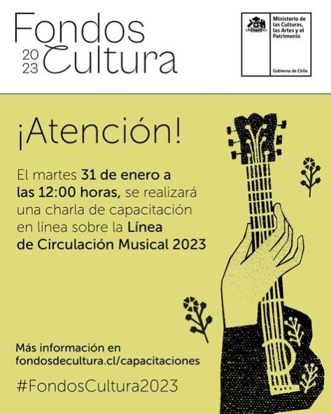 Recuerden que El martes 31 de enero a las 12:00 horas, se realizará una charla de capacitación online sobre la Línea de Circulación Musical 2023.