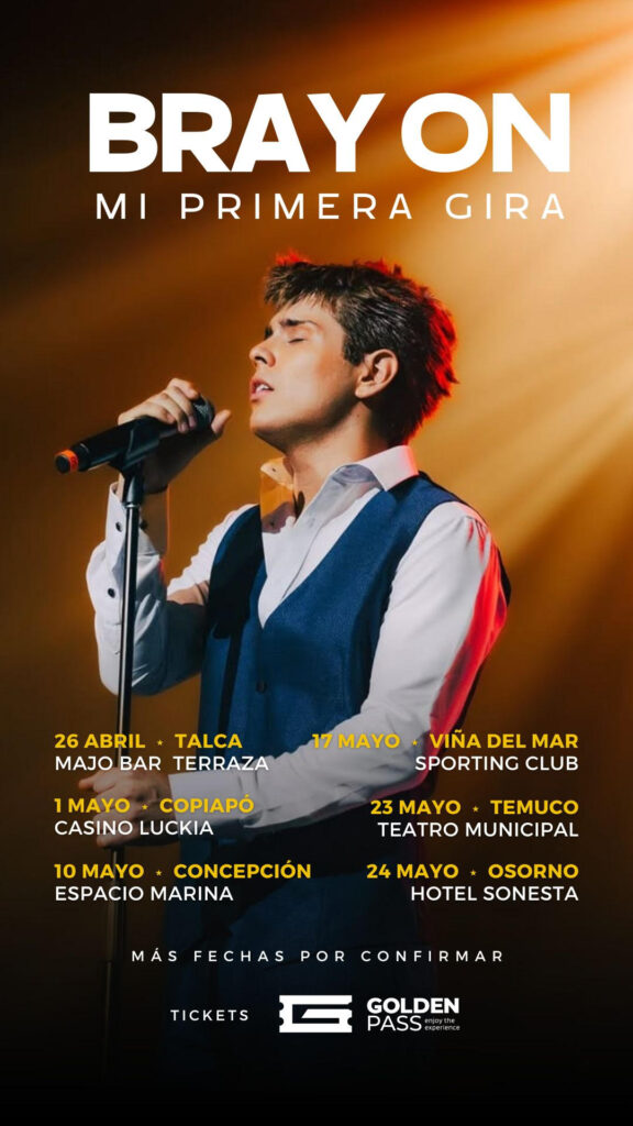 Dentro de su tour «Mi Primera Gira y Despedida», Bray On llegará próximamente a Viña del Mar, presentándose en el Valparaíso Sporting Club. En esta ocasión, ofrecerá un espectacular concierto en vivo junto a su banda, rindiendo tributo al «Sol de México» e interpretando también su música original, incluyendo sus últimos singles «Morfina» y «No me Digas No», disponibles en plataformas digitales y redes sociales.