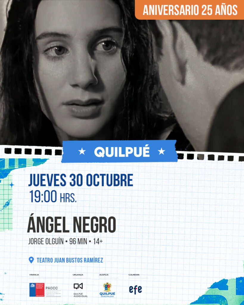 A 25 años del estreno de la icónica película chilena Ángel Negro, dirigida por Jorge Olguín, el Centro Cultural Quilpué Audiovisual junto a la Municipalidad de Quilpué presentan una función especial en pantalla grande para revivir esta obra que marcó en el cine de terror nacional.