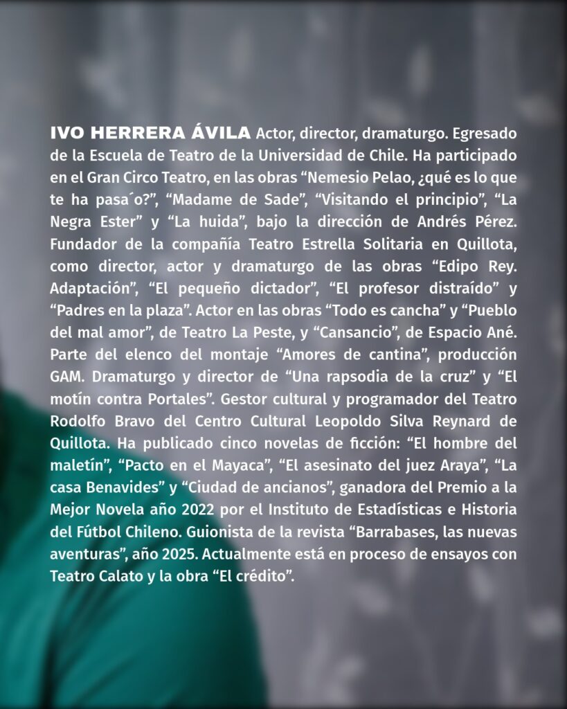 La actividad será guiada por Ivo Herrera Ávila, actor, director y dramaturgo egresado de la Escuela de Teatro de la Universidad de Chile, con amplia trayectoria en compañías como Gran Circo Teatro, Teatro La Peste y Espacio Ane, además de una prolífica carrera como dramaturgo, gestor cultural y escritor.