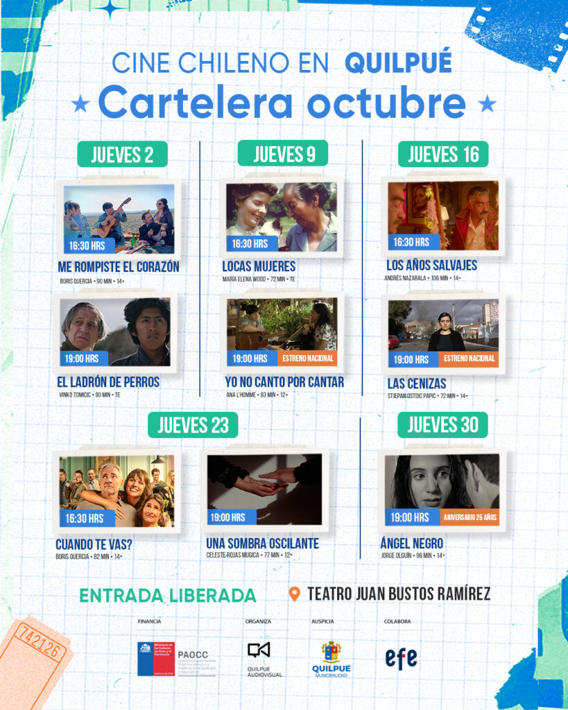 Durante octubre, el Centro Cultural Quilpué Audiovisual en colaboración con la Municipalidad de Quilpué, presenta una cartelera con doble función todos los jueves en el Teatro Juan Bustos Ramírez de Quilpué.