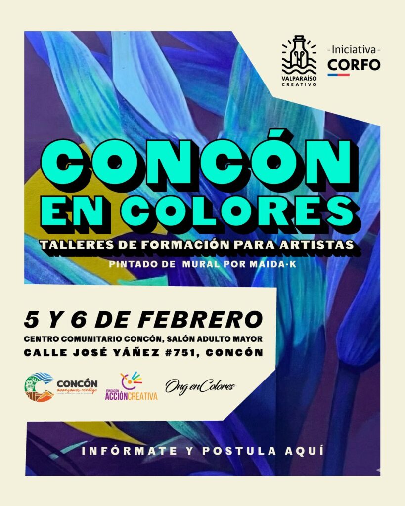 Entre el jueves 5 y el domingo 8 de febrero, se desarrollará el programa Concón en Colores que contempla un ciclo de talleres de formación para artistas, creadores/as y agentes culturales, junto con la realización de un mural de arte urbano, que será ejecutado por la reconocida artista Maida-K, aportando una intervención visual al espacio público de la comuna.