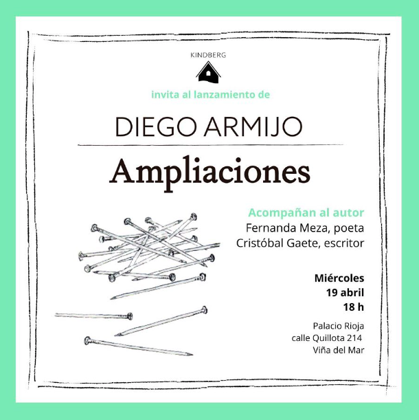 La presentación de Ampliaciones se realizará el próximo miércoles 19 de abril a las 18:00 horas en la sala Aldo Francia del Palacio Rioja (calle Quillota 214, Viña del Mar). Acompañarán al autor el escritor Cristóbal Gaete y la poeta Fernanda Meza y al acabar el acto habrá un cocaví y ejemplares a la venta. La entrada es gratuita.
