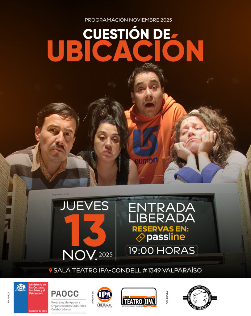 Se acaba el año y el Centro Cultural IPA sigue ofreciendo una variada y nutrida programación cultural durante el mes de noviembre. Es así como este miércoles 12, a las 17 hrs. y jueves 13, a las 19 hrs. se presentará la obra “Cuestión de ubicación”, a cargo de la Compañía de Teatro IluCión, con entrada liberada, en una función dirigida a públicos prioritarios (adultos mayores de la región) y otra abierta al público en general respectivamente, gracias al Programa de Apoyo a Organizaciones Culturales Colaboradoras del que es parte el Centro Cultural IPA y que es financiado por el Ministerio de las Culturas, las Artes y el Patrimonio.