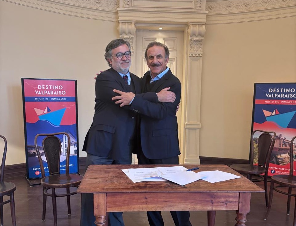 El presidente del Consejo Nacional de Televisión (CNTV), Mauricio Muñoz, y el director ejecutivo de la Fundación Dib y de Destino Valparaíso, Eduardo Dib, firmaron un convenio de colaboración entre ambas instituciones que permitirá la exhibición permanente del material audiovisual del proyecto “Inmigrantes” en Destino Valparaíso y su Museo del Inmigrante.