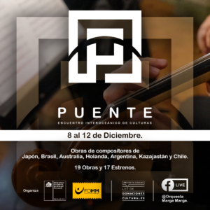 PUENTE 2020. Encuentro interoceánico de las culturas” es la segunda versión de un festival que reunirá a obras de la música contemporánea de distintas latitudes del mundo y de la Región de Valparaíso. El evento se efectuará en Viña del Mar, Valparaíso, Concón y Puchuncaví entre el 8 al 12 de diciembre próximos, en los que se efectuarán conciertos con obras de compositores consagrados y emergentes de cuatro continentes, dentro de una parrilla temática.