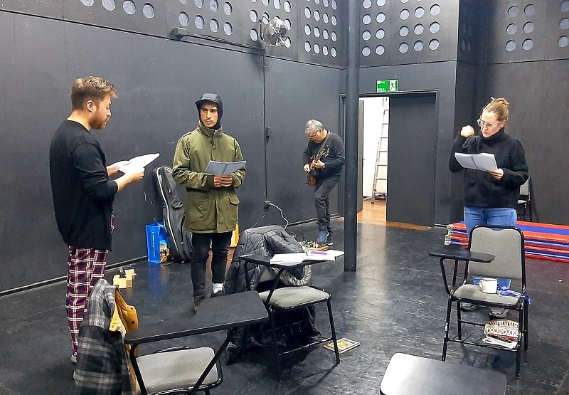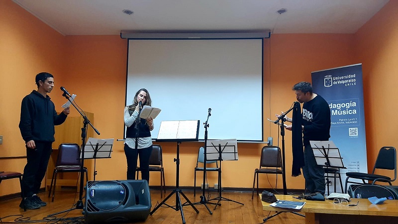 “Estamos poniendo en escena un texto que no había sido montado antes, es un desafío y gran descubrimiento entrar a este universo narrativo. Cuando asumí la dirección de la CIAUV lo primero que propuse fue hacer una obra. Nos hicimos cargo de la idea con Paul Hernández, profesor de la carrera de Pedagogía en Música. Con Paul empezamos a conversar sobre el material a trabajar para la búsqueda creativa y ‘Diálogos de Desaparecidos’ nos pareció pertinente e interesante. Convocamos a tres profesionales de la Escuela de Teatro UV y realizamos un trabajo muy concienzudo y sensible. Fuimos aportando creativa e interpretativamente desde los textos, su significancia, desde la composición musical de Paul hasta nuestras voces en escena”.