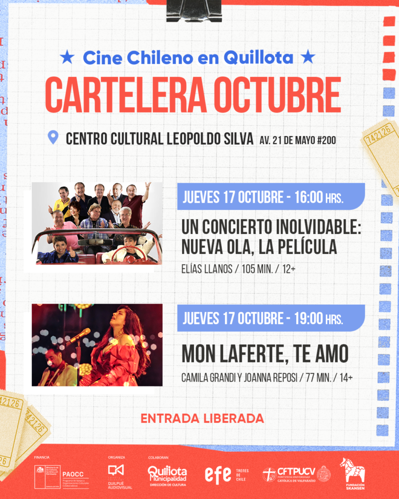 La cita es para el jueves 17 de octubre a las 16:00 horas con la exhibición de «Un concierto inolvidable: Nueva Ola, la película”. Dirigida por Elías Llanos, narra la historia de 12 figuras prominentes de este movimiento nacido en los años 60. Motivados por la nostalgia, se proponen grabar una película y buscan distintas formas de culminar con un emotivo concierto en el Teatro Municipal de Santiago.