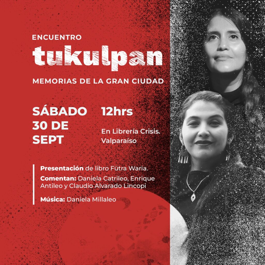 “En nuestra memoria” es el nombre del II Encuentro Tukulpan, que tendrá su primera jornada el próximo sábado 30 de septiembre, al mediodía, en la Librería Crisis de Valparaíso, con la presentación del libro “Fütra Waria. Imágenes, escrituras e historias mapuche en la Gran Ciudad 1927-1992”, junto a sus autores, los investigadores Enrique Antileo, Claudio Alvarado Lincopi, la destacada escritora Daniela Catrileo y la música de la cantautora mapuche Daniela Millaleo, quien ha ganado reconocimiento por su música, fusionando elementos de la tradición mapuche con sonidos contemporáneos.