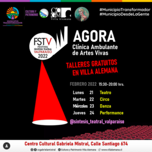 El Festival Síntesis Teatral presenta ÁGORA, cuatro clínicas ambulantes que se estarán realizando en el Centro Cultural Gabriela Mistral de la Ciudad del 21 al 24 de febrero 2022.