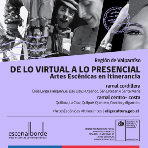 En un año marcado por la emergencia sanitaria, escenalborde la plataforma de artes escénicas contemporáneas, radicada en Valparaíso apuesta por la asociatividad entre los distintos actores locales vinculados a las artes escénicas y la necesaria dinamización del territorio, con el proyecto “De lo virtual a lo presencial”, parte del Programa de Artes Escénicas Itinerantes Regionales, impulsada por la Secretaría Ejecutiva de Artes Escénicas, del Ministerio de las Culturas, las Artes y el Patrimonio.