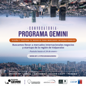 ¿Quieres llevar tu idea de negocio a a mercados internacionales? Comienza hoy el proceso, postulando al programa GEMINI, que busca apoyar a empresas y startup de la región que estén pensando llevar su idea o negocio en mercados extranjeros.