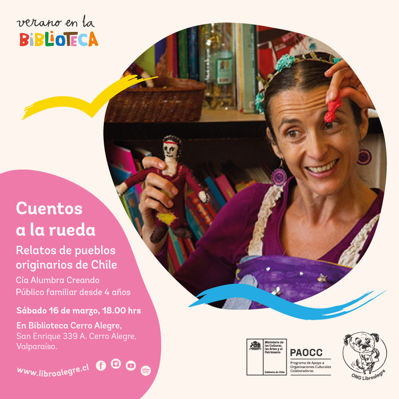 Libroalegre reabre sus puertas y con ello su programación cultural dirigida a grandes y chicos, y financiada a través del Programa de apoyo a organizaciones culturales colaboradoras (PAOCC), convocatoria 2023, del Ministerio de las Culturas, las Artes y el Patrimonio. Al ruedo de un gran faldón, este sábado 16 de marzo la actriz y narradora oral Vicky Silva, de la cía. Alumbra Creando, relatará dos historias de pueblos originarios chilenos.