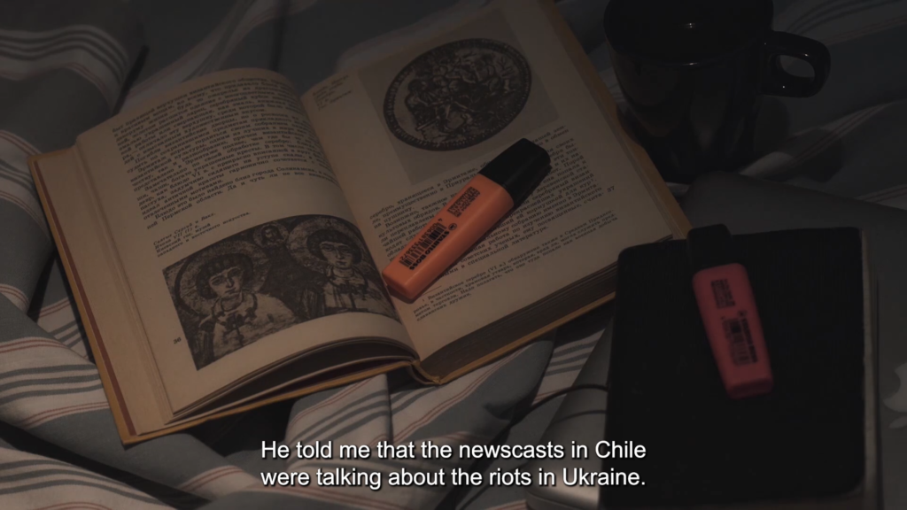 Al principio, la relación entre Chile y Ucrania surgió únicamente en el montaje. Después de filmar la embajada de Ucrania en Buenos Aires, decidí grabar también la embajada de Chile, ubicada a pocas cuadras de donde fue asesinado Carlos Prats. Esto me conectó con otra época de violencia política, pero esta vez la distancia no era geográfica, sino temporal. Lo que inicialmente comenzó como un juego formal de montaje, relacionando dos pueblos distantes, fue revelando poco a poco una especie de espejo entre Ucrania y Chile.
