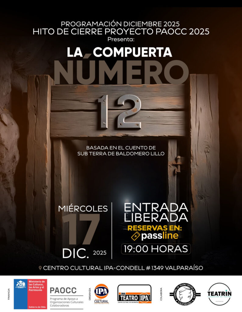 “La Compuerta Número 12” invita al espectador a enfrentarse a una realidad tan dura como vigente, y se presentará con entrada liberada el miércoles 17 de diciembre a las 19:00 hrs. en la Sala de Teatro IPA de Valparaíso, gracias financiamiento del Ministerio de las Culturas, las Artes y el Patrimonio a través de su Programa de Apoyo a Organizaciones Culturales Colaboradoras, y está dirigida a todo público.