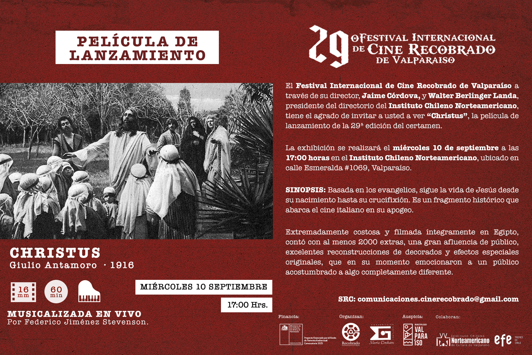 El Festival Internacional de Cine Recobrado de Valparaíso a través de su director, Jaime Córdova, y Walter Berlinger Landa, presidente del directorio del Instituto Chileno Norteamericano, tiene el agrado de invitar a usted a ver Christus, la película de lanzamiento de la 29ª edición del certamen, que estará musicalizada en vivo por el pianista Federico Jiménez Stevenson.