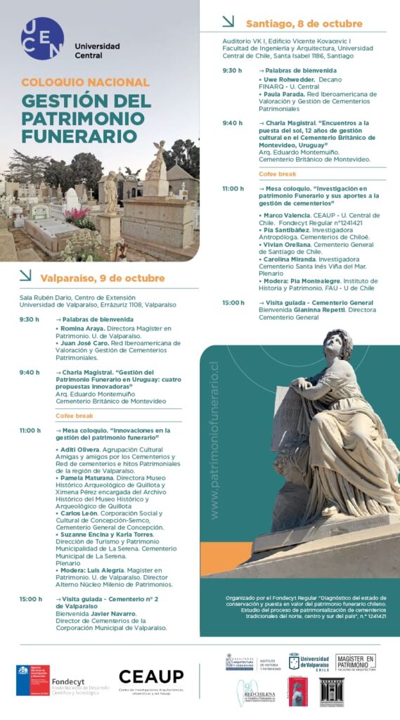 Este encuentro es organizado por el proyecto Fondecyt Regular “Diagnóstico del estado de conservación y puesta en valor del patrimonio funerario chileno”, con la colaboración de diversas instituciones académicas y culturales.