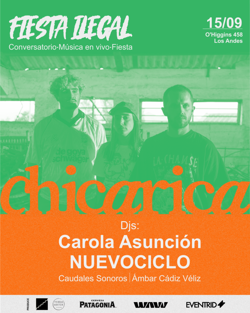Posteriormente, la fiesta continuará a cargo del dj local NUEVOCICLO, quien preparará el ambiente para la esperada presentación en vivo de chicarica, proyecto que se ha consolidado como una de las propuestas actuales más originales e interesantes de la música alternativa en Chile. Para cerrar la jornada, la dj Carola Asunción hará bailar a los presentes hasta la madrugada.