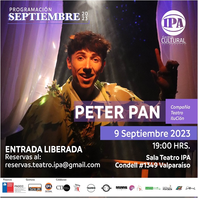 El sábado 9 de septiembre a las 19:00 horas se presenta la Compañía de Teatro IluCión con el montaje “Peter Pan”, conmemorando los 30 años de la compañía en la Sala de Teatro IPA, Condell #1349, Valparaíso.