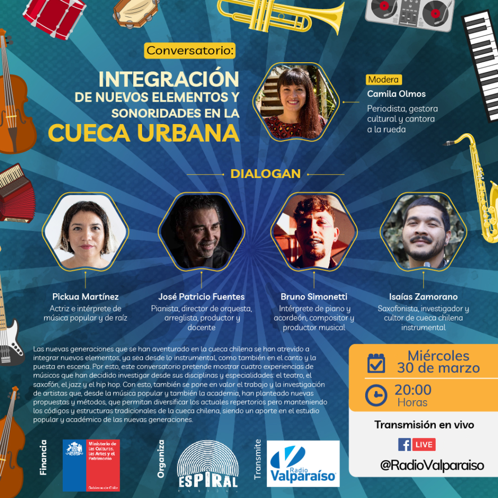 Camila Olmos, gestora de esta instancia invitó “a escuchar atentamente esta conversación y a conocer el trabajo de los y las artistas, para entender las dinámicas de la cueca y ver de qué manera las nuevas generaciones están rompiendo prejuicios y formas impuestas de expresión del folclor en nuestro país”.