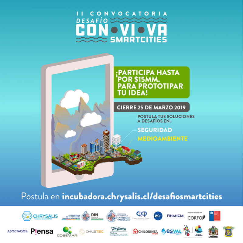 La incubadora de negocios Chrysallis de la PUCV está haciendo un llamado para participar de la convocatoria Desafío CON-VI-VA Smarticities que tiene por objeto la selección de proyectos o ideas de negocios que cuenten con alto potencial de crecimiento, con el propósito de acelerar su puesta en marcha y desarrollo, por medio de una serie de servicios brindados por Chrysalis PUCV.