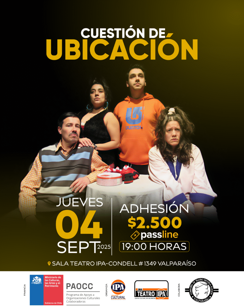 Sala Teatro IPA, Condell # 1349 Valparaíso. Valor entrada: $2.500 a través de https://www.passline.com/eventos/cuestion-de-ubicacion