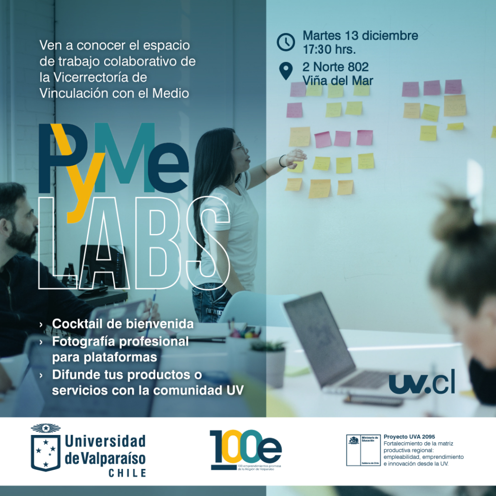 Este martes 13 a las 17:30hrs. será el lanzamiento de los espacios PYMELABS de #100E de la Universidad de Valparaíso. La actividad se realizará en la Vicerrectoría de Vinculación con el Medio, ubicada en 2 norte 802 Viña del Mar.