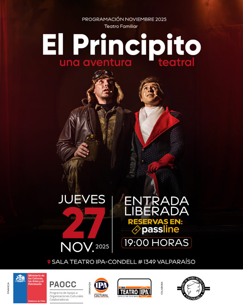 “El Principito, una aventura teatral” se presentará en única función el jueves 27 de noviembre a las 19:00 hrs. en la Sala de Teatro IPA de Valparaíso con entrada liberada, gracias financiamiento del Ministerio de las Culturas, las Artes y el Patrimonio a través de su Programa de Apoyo a Organizaciones Culturales Colaboradoras, y está dirigida a todo público.