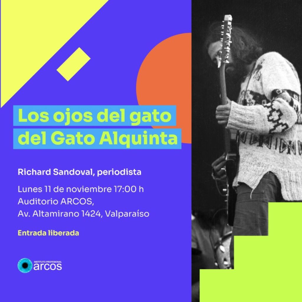 En el Auditorio de ARCOS, de Altamirano 1424, se presentará el periodista Richard Sandoval, autor del libro “Los ojos del Gato. La maravillosa vida de Eduardo Alquinta”, que plantea diferentes interrogantes e indaga en la biografía de uno de los líderes de Los Jaivas, una de las bandas más importantes de la historia musical chilena. A través de numerosas entrevistas y recopilación de fuentes, el autor expone las luces y sombras del compositor autodidacta, que puso letra y música a boleros en Valparaíso y musicalizó versos de Neruda.