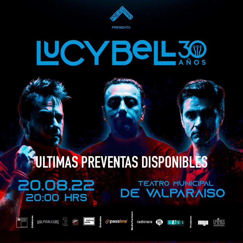 ¡Últimas Plateas y Balcones Disponibles! Se acerca la fecha: hacia el fin del invierno la mítica banda nacional, Lucybell, conmemora tres décadas Sábado 20 agosto 20:00 hrs. Teatro Municipal de Valparaíso para un concierto inolvidable en el reacondicionado escenario porteño.