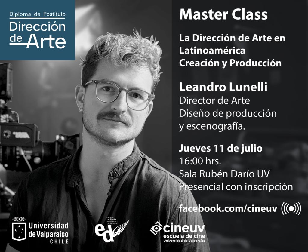 En el marco del Diploma de Postítulo Dirección de Arte que organiza las Escuelas de Diseño y Cine de la Facultad de Arquitectura de la Universidad de Valparaíso, se presentará la primera master class que dictará Leandro Lunelli, director de arte. En esta clase magistral, Lunelli compartirá su experiencia profesional sobre el rol del Director de Arte en América Latina, abarcando diversos formatos audiovisuales y su interacción con los distintos departamentos de arte. Además, abordará las decisiones relacionadas con la creación, producción y gestión de recursos disponible en el contexto de un proyecto audiovisual.
