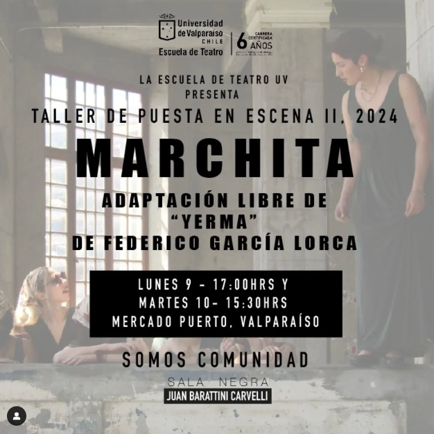 Dos propuestas fueron elaboradas a través de la asignatura Taller de Puesta en Escena II de la Escuela de Teatro UV. Los días lunes 9 a las 17:00 y martes 10 de diciembre a las 15:30 horas se presenta “MARCHITA” en el Mercado Puerto de Valparaíso, adaptación libre de “Yerma” de Federico García Lorca. “EN MEDIO DEL CERRO, UN REFUGIO” es una creación colectiva que se presenta en las escaleras del Cerro Polanco el día jueves 12 de diciembre con funciones a las 10:00 y 12:00 horas, partiendo a las afueras del ascensor Polanco.