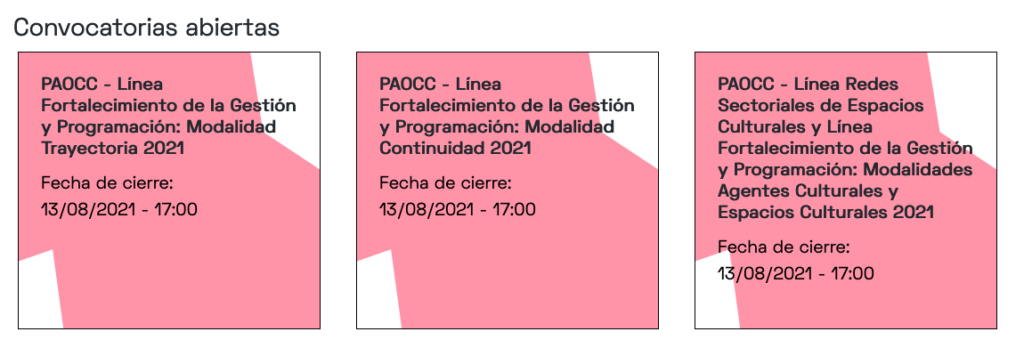 Ya están abiertas las Convocatorias PAOCC (Programa Apoyo a Organizaciones Culturales Colaboradoras). Este se encuentra enfocado en entregar apoyo y financiamiento a organizaciones culturales intermediadoras que ofrecen a sus públicos programación, contenidos y/o productos artísticos, con el fin de que puedan fortalecer sus capacidades y aumentar sus posibilidades de sostenibilidad.