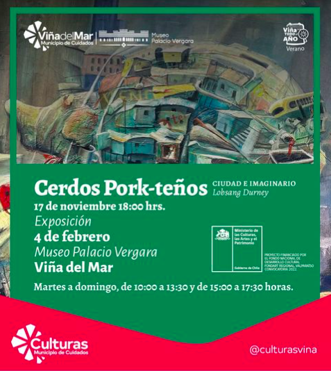 La Colección Eulogio Rojas, Proyecto Educativo, Cultural y Social, invita a la exposición «Cerdos Pork-teños» de Lobsang Durney, que está disponible hasta el 4 de febrero en el Museo Palacio Vergara de Viña del Mar.