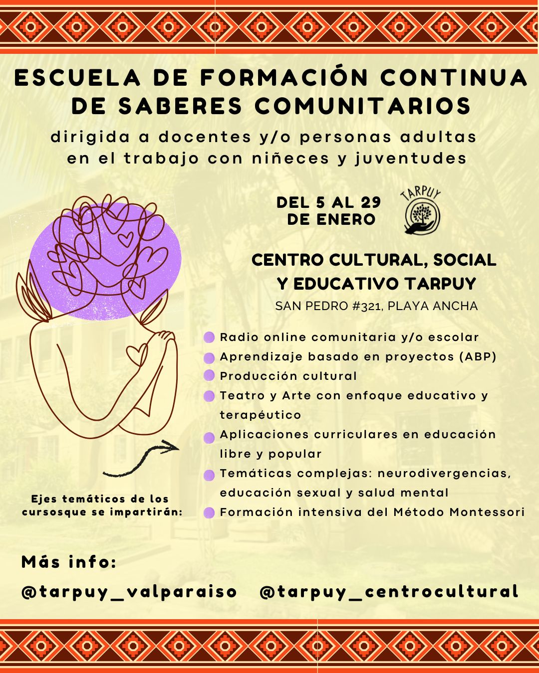 Entre el 5 y el 29 de enero, el Centro Cultural, Social y Educativo Tarpuy desarrollará una programación intensiva de cursos y talleres dirigida a docentes y personas adultas que