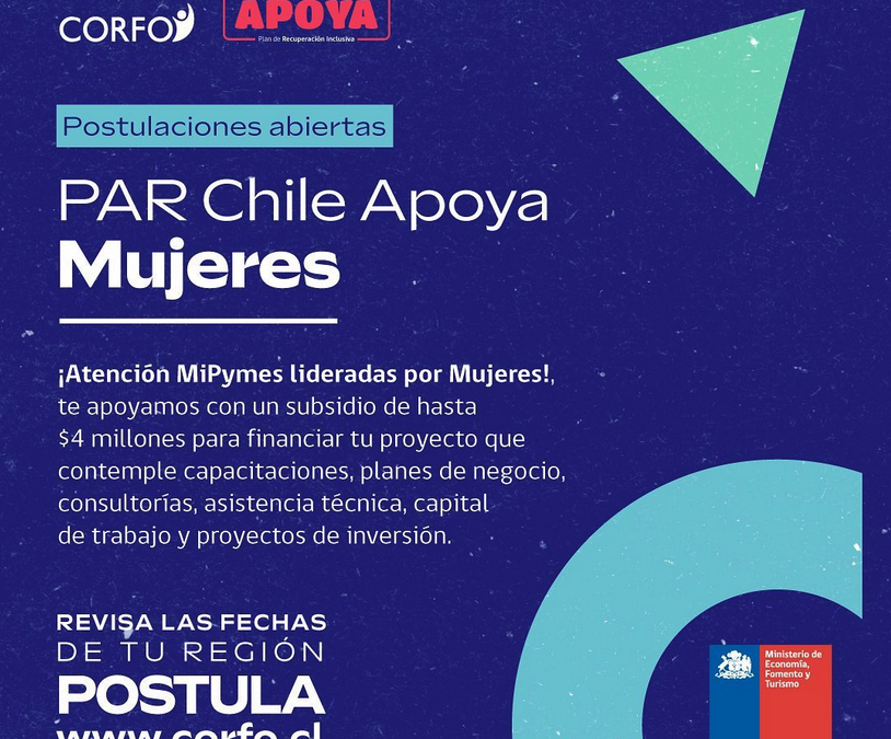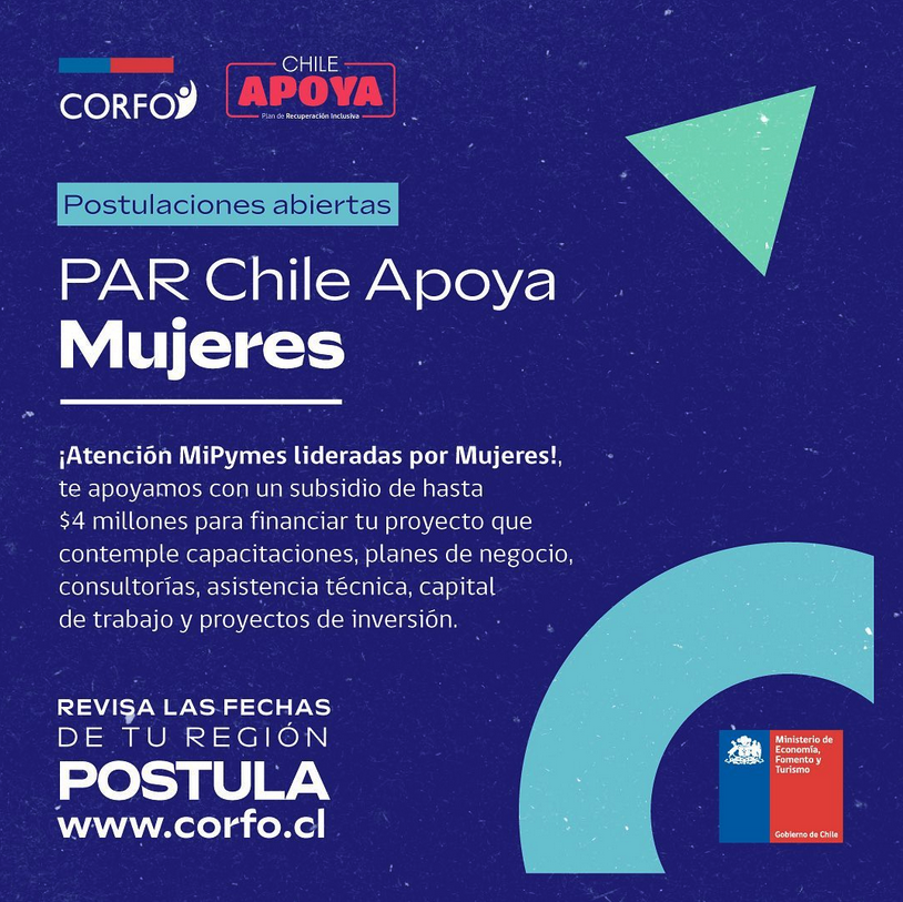 PAR Chile Apoya es un programa de Corfo Chile que busca apoyar a micro, pequeñas y medianas empresas del sector de las industrias creativas, en la recuperación de su potencial productivo y de gestión, a través del financiamiento de proyectos individuales que contemplen capacitación, planes de negocio, consultorías, asistencia técnica, capital de trabajo y/o proyectos de inversión.