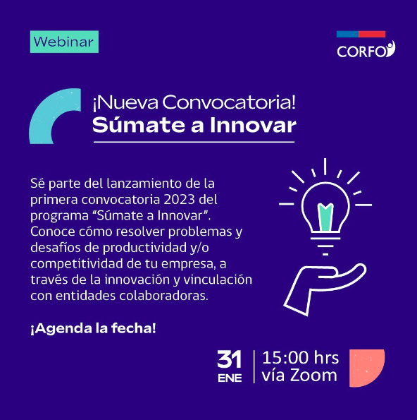 Te invitamos desde #Corfo Valparaíso a participar en el #webinar de lanzamiento del programa Súmate a Innovar. La actividad está prevista para el martes 31 y es totalmente gratuita.