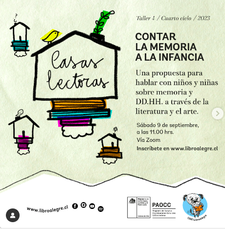 #CuentosParaNoOlvidar 📚☝️ ¡Nuevo taller de #CasasLectoras! 🧑💻✨ Este sábado 9 de septiembre, la invitación es a hablar con niños y niñas sobre #memoria y #DerechosHumanos a través de la literatura y el arte.