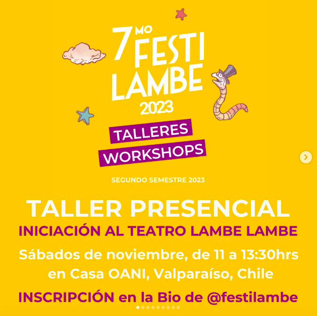 Los sábados 4, 11, 18 y 25 de noviembre de 11:00 a 13:30 horas se realizará de manera presencial y gratuita el Taller “Iniciación al Teatro Lambe Lambe” en Casa OANI, ubicada en Cerro Cárcel de Valparaíso. Las sesiones serán facilitadas por Adelaida Loyer, José Moraga y Camila Landon de Fundación OANI Teatro, siendo parte de la extensión del programa del 7° FESTILAMBE, proyecto financiado por el Fondo de Artes Escénicas 2023.