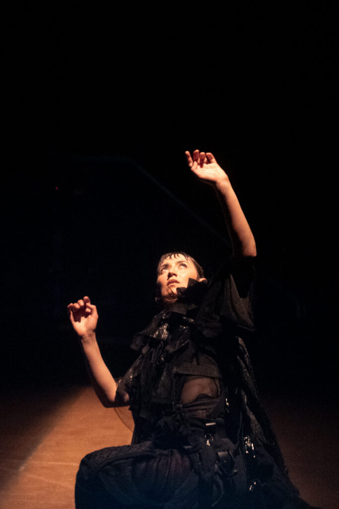 Así, la obra se desarrolla como un ritual donde el cuerpo se presenta en un continuo estado de metamorfosis, velando y develando imaginarios de cuerpos a través de una coreografía que mueve «la pregunta por la luz». Entre umbrales de sombra y luminosidad, en este solo de danza contemporánea, la directora e intérprete del proyecto, Daniella Santibánez, realiza un ocultamiento simbólico a través del revestimiento de su propio cuerpo, cubierto por capas de prendas negras que forman un vestuario-interfaz realizado por el arquitecto y artista escénico Andrés Benjamín.