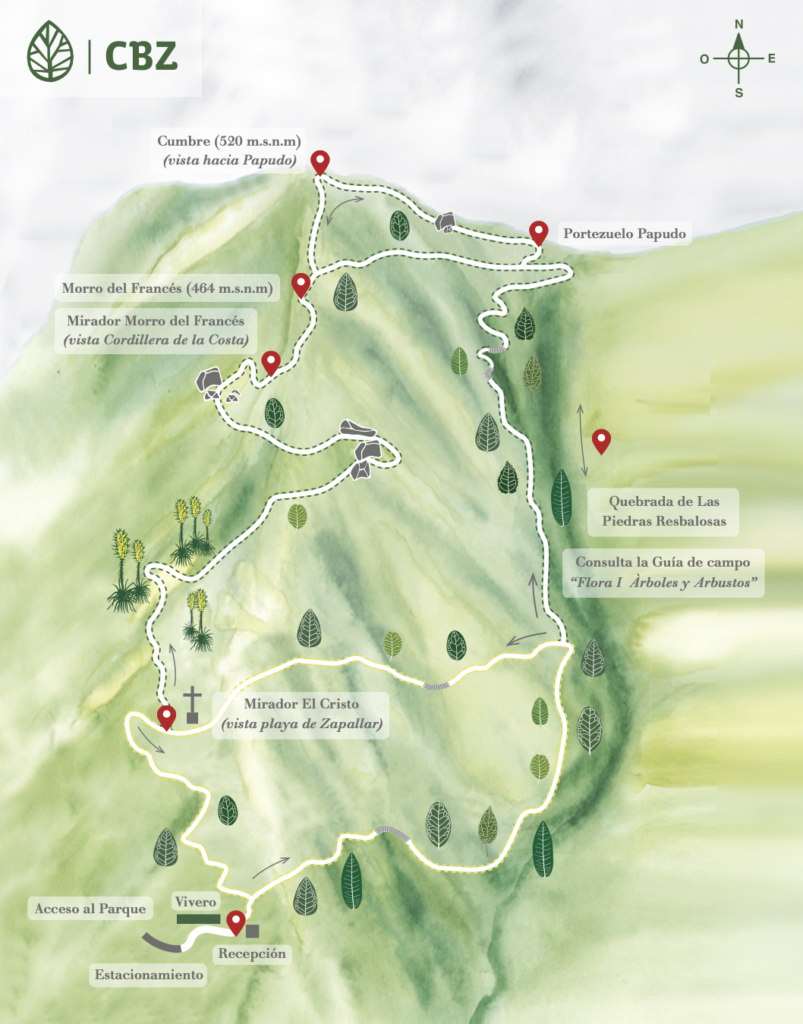 El recorrido total es de aproximadamente dos horas, con una dificultad media-alta debido a su inclinación ya que es en subida. Sin embargo, está diseñado para que cada visitante lo disfrute a su ritmo, haciendo pausas en los puntos señalizados. Desde la cima del cerro, podrás disfrutar de vistas realmente impresionantes: por un lado, el océano y, por el otro, la Cordillera de los Andes si está despejado, enmarcando el verde exuberante del bosque.