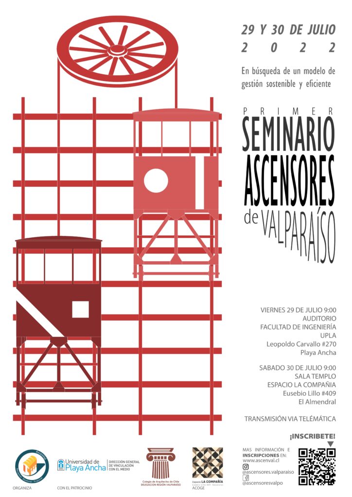 El próximo viernes 29 y sábado 30 de julio (en Espacio la Compañía), se llevará a cabo en distintos puntos el 1er seminario de Ascensores de Valparaíso, En busca de un modelo de gestión sustentable y eficiente, se invita a tod@s I@s vecin@s y organizaciones a participar de este encuentro que busca un diálogo abierto y constructivo sobre el pasado, presente y futuro de nuestro medio de transporte patrimonial.