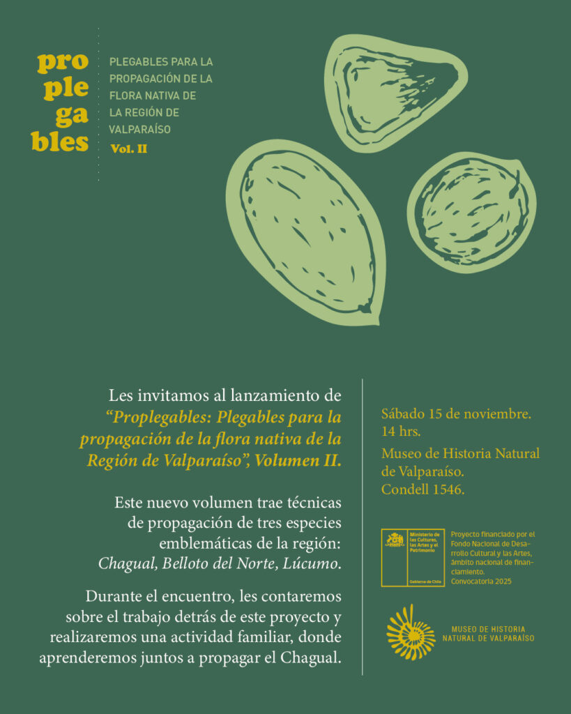 El próximo sábado 15 de noviembre a las 14:00 horas, el Museo de Historia Natural de Valparaíso será sede del lanzamiento del Volumen II de Proplegables, un proyecto que reúne arte, ciencia y educación ambiental en torno a la propagación de especies nativas del territorio regional. La actividad contará con una activación práctica de propagación, abierta a todo público, para acercar a niñas, niños y adultos a los ciclos de la naturaleza a través de la experiencia directa con la semilla.