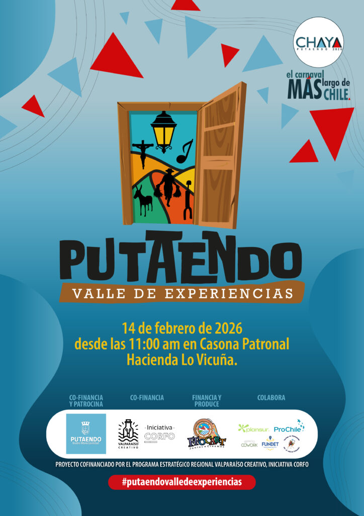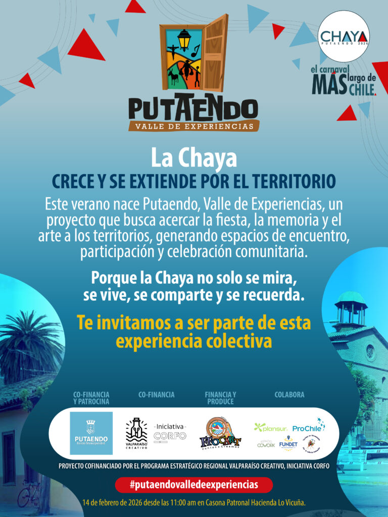Con un fuerte énfasis comunitario, “Putaendo, Valle de Experiencias” busca resignificar el Carnaval de la Chaya como una manifestación cultural identitaria viva, capaz de integrar nuevas disciplinas artísticas, visibilizar el trabajo de creadoras y creadores locales y acercar la cultura a públicos diversos, especialmente de sectores rurales y distintos grupos etarios.
