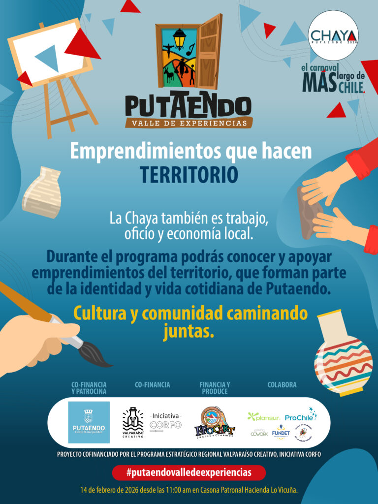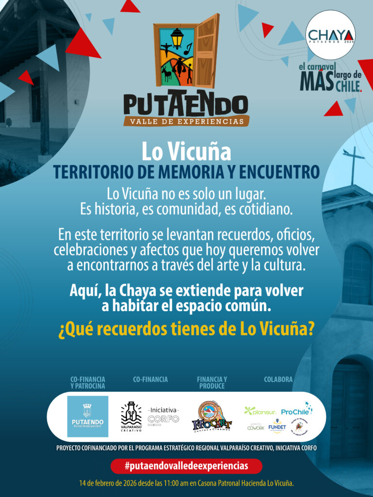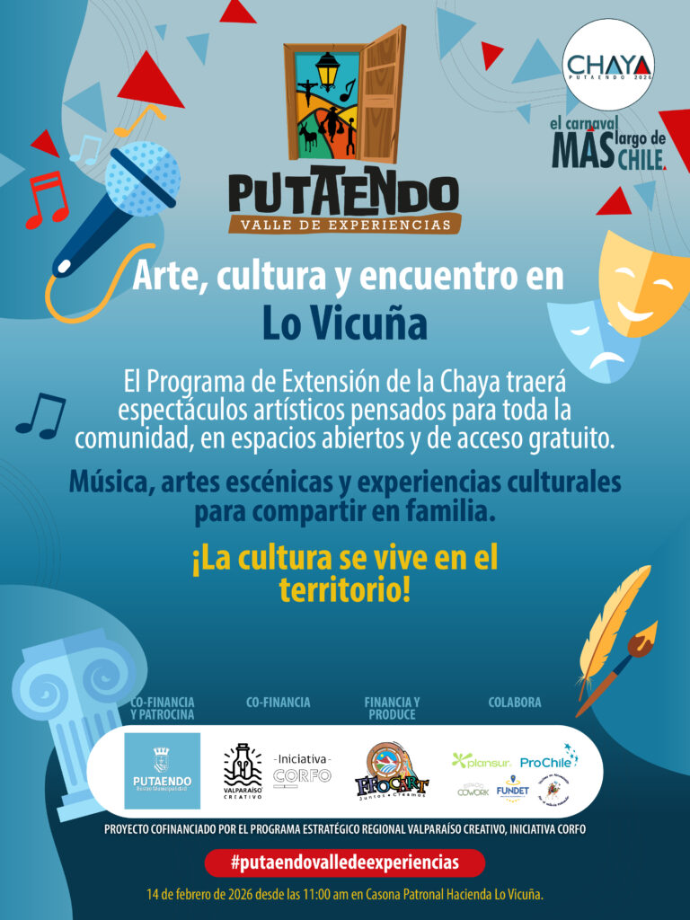 La Fundación para el Fomento de la Cultura, las Artes, la Recreación y el Turismo (FFOCART), en conjunto con la Ilustre Municipalidad de Putaendo, invitan a la comunidad a ser parte de “Putaendo, Valle de Experiencias”, un proyecto de extensión cultural del tradicional Carnaval de la Chaya de Putaendo, que se realizará el sábado 14 de febrero en la Hacienda Lo Vicuña.