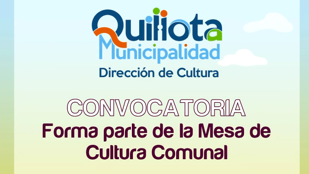La Dirección de Cultura de la Ilustre Municipalidad de Quillota te invita a participar de la “Mesa de cultura comunal” a formarse desde el mes de abril de este año. Esta iniciativa se plantea como un espacio de trabajo que sume a los territorios y los agentes culturales de la comuna en un diálogo transversal, para avanzar juntos en el desarrollo de la actividad artística y el valor cultural y patrimonial de la zona.