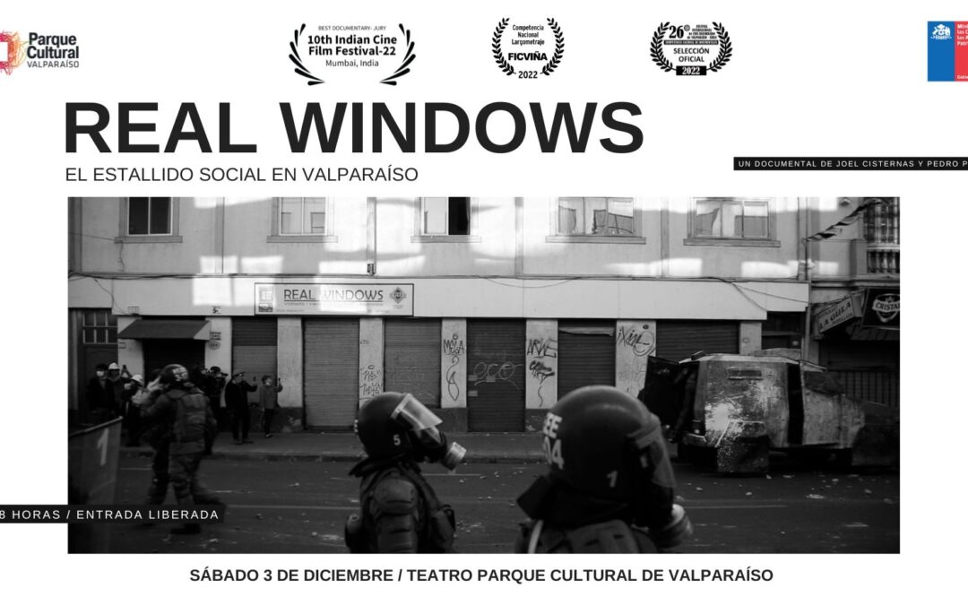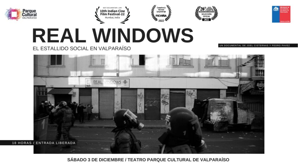 El sábado 3 de diciembre, en el Teatro del parque Cultural de Valparaíso, se realizará la exhibición de la película “Real Windows”, en una función abierta para toda la comunidad. El documental, dirigido por Pedro Pavez y Joel Cisternas, registra el estallido social de octubre de 2019 en Valparaíso y recibió el Premio del Jurado en el Indian Cine Film Fest de Mumbai (India).