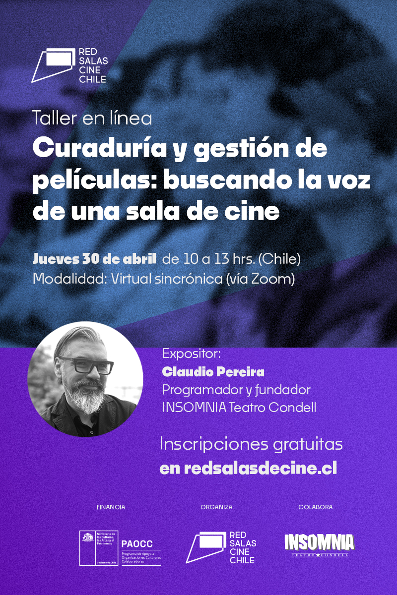 Por otro lado, el jueves 30 de abril se realizará el taller Curaduría y gestión de películas: buscando la voz de una sala de cine, a cargo de Claudio Pereira, fundador y programador de la sala INSOMNIA Teatro Condell y Director Artístico de la Semana Internacional del Cine de Valparaíso. La exposición se centrará en el ámbito de la curatoría y la gestión de contenidos de una sala de cine, en el contexto del ecosistema cultural y cinematográfico contemporáneo.